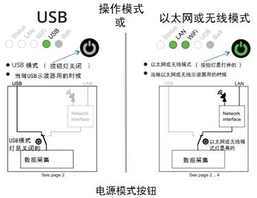 局域網(wǎng)或無線模式,模式按鈕燈開啟,用做局域網(wǎng)或無線示波器