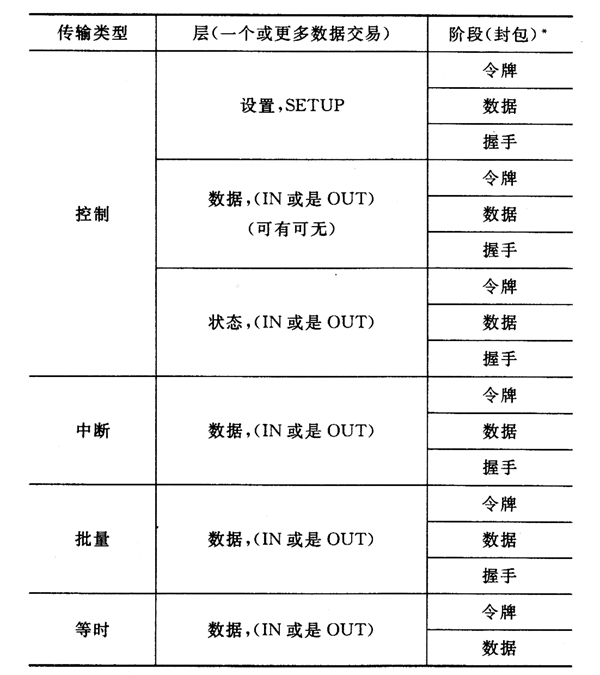 表列出了組成4種傳輸類(lèi)型的元素。在這里,讀者就需要注意一些通信協(xié)議的結(jié)構(gòu)。例如,傳輸與數(shù)據(jù)交易、數(shù)據(jù)交易與封包、封包與字段之間的關(guān)系。當(dāng)然,這是相當(dāng)復(fù)雜且容易弄混淆的地方。其中,傳輸包含1個(gè)或是更多的數(shù)據(jù)交易,每一個(gè)數(shù)據(jù)交易又包含1個(gè)、2個(gè)或是3個(gè)封包。而封包中,又包含封包標(biāo)識(shí)符(PID)字段、檢查字段(CRC)以及額外的信息字段。