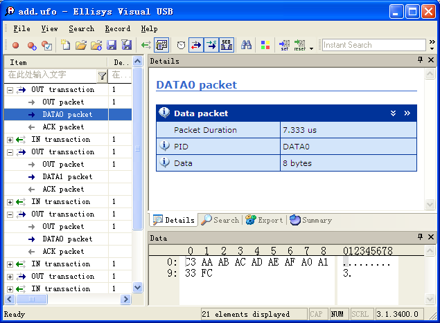 下面,我們用Ex200來(lái)捕獲發(fā)送的ADD指令數(shù)據(jù)以及其前后過(guò)程。分析捕捉到的數(shù)據(jù)搜索到DATA0,DATA1數(shù)據(jù)包內(nèi)容皆為“AA AB AC AD AE AF A0 A1”,與源代碼一致。如圖所示,為DATA0數(shù)據(jù)包的內(nèi)容。我們每次按下ADD控件,就可以捕獲到這一組數(shù)據(jù),這說(shuō)明USB通信沒(méi)有問(wèn)題,可以進(jìn)行下一步的大數(shù)據(jù)量傳輸與通信。