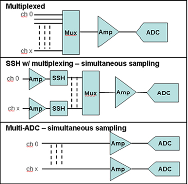 與平行的多重ADC架構(gòu)相較,由于每個通道的成本已降低甚多,因此要如何選擇使用SSH/多任務架構(gòu)以切合所需就特別重要。若要將SSH電路附加至復雜的多任務架構(gòu)時,則必須考慮額外的趨穩(wěn)時間(Settling Time)與潛時問題。SSH電路的潛時包含保持/追蹤模式的趨穩(wěn)時間,以及所有輸入通道共享的掃描速率,均將影響這些裝置能否順利套用至高采樣率的同步采樣應用,如聲音、振動與瞬時記錄(Transient Recording)。