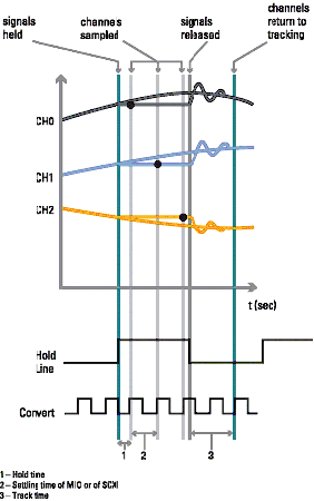 在作業(yè)期間,SSH電路可于各個輸入掃描之前,先行追蹤所接收的信號。在掃瞄開始前,DAQ裝置將同步針對SSH電路置于保持模式,而各組SSH電路中的電容將維持穩(wěn)定的電壓。在依序掃描所有輸入之后,DAQ裝置將SSH電路轉(zhuǎn)為追蹤模式,并等待下一次的保持模式指令,透過SSH的方法,即便是于不同時間進行輸入采樣,亦可同步化輸入電壓(圖2)。