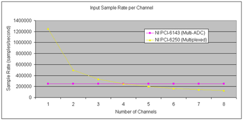舉例來說,若某一款多任務裝置可達100kSample/s采樣率,并掃描八個通道,則采樣率將平均降為每通道12.5kSample/s。若再加上SSH電路與再降低每通道掃瞄率30%的潛時來算,則每通道僅剩8.3kSample/s的采樣率。多任務架構(gòu)并未針對每通道的采樣率進行最佳化,因此亦應為同步采樣應用的重要考慮。若再加上SSH電路,則會進一步降低其可應用性。