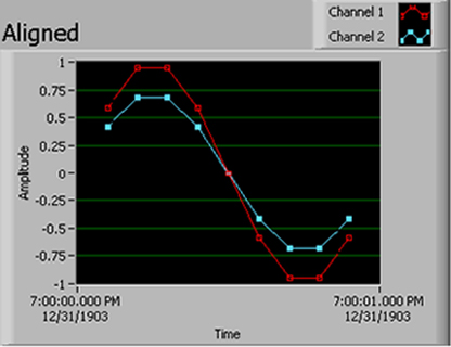 舉例來說,若多任務DAQ裝置并未附加SSH電路,則無法進行同步采樣,然而,由于連續(xù)數(shù)據(jù)點之間有已知的時間延遲,其實可考慮用于波形對齊表達式,此時間延遲可用于對齊多筆信號,且不須附加電路亦可進行同步采樣。