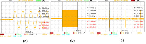 用信號產(chǎn)生器產(chǎn)生一個(gè)FSK信號,調(diào)制脈沖信號的周期設(shè)為2秒,占空比為0.1%(即瞬時(shí)信號持續(xù)2毫秒,載波信號頻率設(shè)為2MHz的正弦,在示波器上可以看到信號的時(shí)域波形如圖2所示。圖2(a)(b)(c)三個(gè)圖是在不同大小的時(shí)基下觀察到的信號波形,從圖中不難理解這種類似TPMS工作信號的長間隔、高頻率、瞬時(shí)特性,類似這樣的信號,在無線傳感器、無線射頻辨識系統(tǒng)(RFID)等許多領(lǐng)域都很常見。