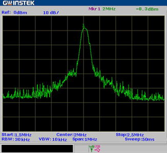 測量信號頻率時(shí),可以打開峰值保持,將中心頻率設(shè)在2MHz。頻率跨度的選擇須考慮與解析頻寬(RBW)的搭配,若測量范圍(SPAN)和RBW相差很大,加上信號擷取困難,測得頻率所需時(shí)間會非常長;若SPAN和RBW相差很小,則容易造成頻率測量不準(zhǔn)確。可選擇30kHz的RBW和1MHz的SPAN,在這種情況下,頻譜分析儀不能保證對每一個(gè)瞬時(shí)信號都能成功擷取,所以在頻譜分析儀上看到的頻譜變化間隔往往大于2秒,這是由于SPAN大于RBW時(shí),若信號進(jìn)入頻譜分析儀時(shí)其實(shí)時(shí)掃描的頻率偏離信號真實(shí)頻率,則信號將無法被擷取,但經(jīng)過稍長的一段時(shí)間(取決于SPAN和RBW之差)后,依然能在峰值保持的模式下觀察到信號累積的頻譜情況,根據(jù)此一圖像可輕易透過搜索峰值讀出信號頻譜中心點(diǎn)的頻率,精準(zhǔn)度可以達(dá)到kHz的級別,如圖3所示,測得信號頻率為2.0MHz。