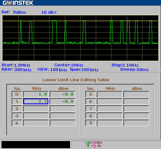 另外,可在頻譜分析儀上設(shè)置通過/失敗(Pass/Fail)的功率限制線(Limit Line),如圖5所示,使功率滿足限制范圍的信號(產(chǎn)品)通過。這一應(yīng)用只須在2.2.2的設(shè)置基礎(chǔ)上進(jìn)入限制線菜單進(jìn)行Pass/Fail功能設(shè)置即可,廠商分析儀產(chǎn)品限制線菜單的設(shè)置靈活,可以方便地編輯使用者須設(shè)定的功率上限和下限。限制線透過表格形式編輯在線的各點(diǎn),各點(diǎn)連成的限制曲線可滿足使用者在不同頻率點(diǎn)有不同功率標(biāo)準(zhǔn)的需要,而非簡單的直線,透過簡單幾個(gè)鍵的設(shè)置,頻譜分析儀即能幫助使用者將符合要求的信號判定為通過,而所有不符合要求的信號都將被準(zhǔn)確無誤地判定為失敗,圖6所示為通過測試時(shí)頻譜儀顯示的畫面。