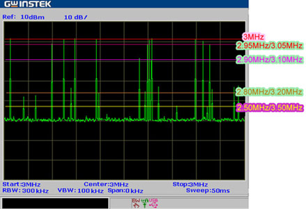 一般產(chǎn)線對信號的頻率和功率同時(shí)都有較嚴(yán)格的要求,分別進(jìn)行功率、頻率通過測試的方法在實(shí)際運(yùn)用中還是稍顯繁瑣,這里推薦另外一種綜合測試的方法,其特點(diǎn)是首先將SPAN設(shè)置為零頻跨,將擷取的信號的持續(xù)時(shí)間設(shè)為500微秒、頻率設(shè)為3MHz的信號、功率1dBm與發(fā)送間隔為1秒,然后利用信號產(chǎn)生器將信號的頻率在3MHz附近調(diào)整。由于中心頻率3MHz,零頻跨的頻譜分析儀掃描的范圍只在3MHz這一點(diǎn)上,根據(jù)濾波器的特性,有微小頻率偏移的信號擷取后的功率會被衰減,分別將信號的頻率以3MHz為中心左右調(diào)偏50kHz、100kHz、200kHz和500kHz,信號衰減后的功率幅度如圖7所示。