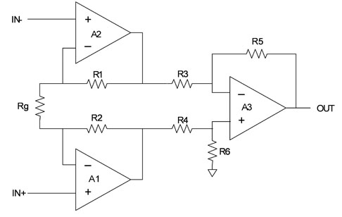 典型的四電阻差動(dòng)放大器相較于其初次現(xiàn)身時(shí)還要復(fù)雜得多。利用一顆完美的運(yùn)算放大器,CMRR會(huì)藉由電阻的匹配而受到限制(圖2中的R3~R6)。一顆差動(dòng)放大器CMRR的近似值為: