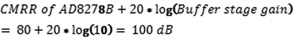 其增益也會(huì)使共模拒斥提高23分貝(dB),因?yàn)楣材T鲆媸且恢碌?參照公式3)。計(jì)算AD8221 BR的預(yù)期最小共模訊號(hào)拒斥比(CMRR),顯示出因?yàn)樵鲆娑斐傻奶岣摺?依據(jù)技術(shù)手冊使用增益=1)。