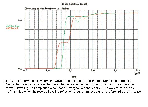 盡管這樣的終端匹配使接收器上的波形非常好,但波形在走線上的每一點(diǎn)都呈階梯形。階梯波形并不適于邏輯分析儀,因?yàn)樵诖似陂g,該波形的幅值只有一半。邏輯分析儀不能分辨出它是邏輯“1”還是邏輯“0”。圖3顯示了這種情況下的波形。請注意,接收器端的這種波形有較高的信號(hào)質(zhì)量,而探頭尖上被測到的波形質(zhì)量則很是不可接受的。隨著信號(hào)速度上升,探頭尖上的信號(hào)質(zhì)量對(duì)成功測量越來越重要。