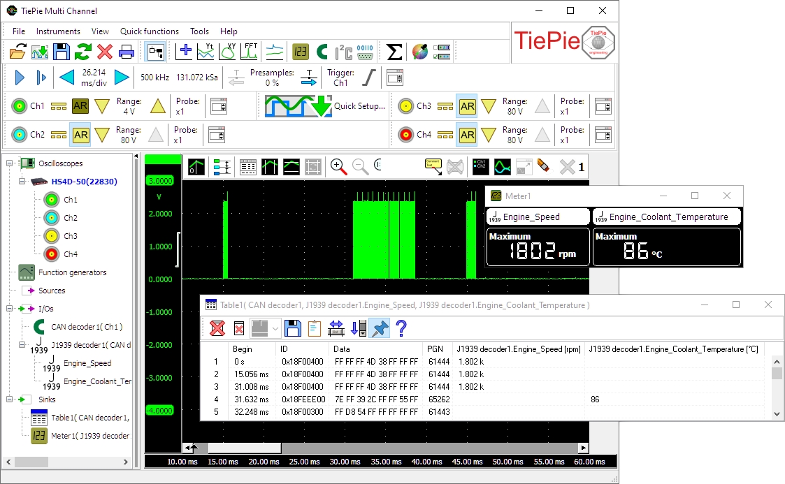 圖4顯示了被測(cè)量的差速器hs4Dff測(cè)量的差速器可以信號(hào)。解碼后的CAN消息顯示在 桌子 .從CAN消息解碼的J1939值被添加到表中,并在 米 顯示。
