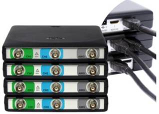 Handyscope HS5配有精細(xì)化同步總線,允許相互連接多個Handyscope HS5的儀器,然后作為聯(lián)合儀器使用。聯(lián)合的Handyscope HS5其中之一會充當(dāng)主站,其他的為從動裝置。所有儀器會在相同的采樣頻率下測量(0ppm偏差!)。除了同步總線之外,還有觸發(fā)器總線和檢測總線系統(tǒng)。多個Handyscope HS5可以使用耦合電纜相互連接。儀器的最大連接數(shù)量僅僅受可用的USB接口數(shù)量限制。