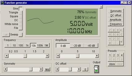 信號的振幅可自由在0V和12V之間設置,A DC偏移在0和12 V之間對信號適用,也就是說信號的對稱性,從1%到99%從可以被改變,信號的頻率能設置為0到2MHz。這信號發(fā)生器也提供掃頻功能,掃頻功能可同頻譜分析一起操作,也能手動操作,并且還能從頻譜分析中由低頻到高頻拷貝掃頻極限值,同“測量最大值”方式一起,在頻譜分析中給出快速和容易的方法,建立頻率應答曲線。
