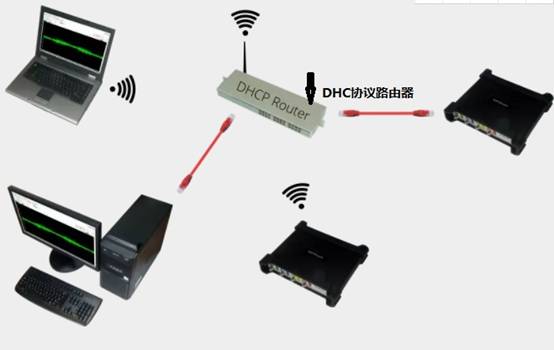 在無線WiFi網(wǎng)絡(luò)中,一臺或多臺無線數(shù)據(jù)采集卡可連接到一臺電腦或多臺電腦。