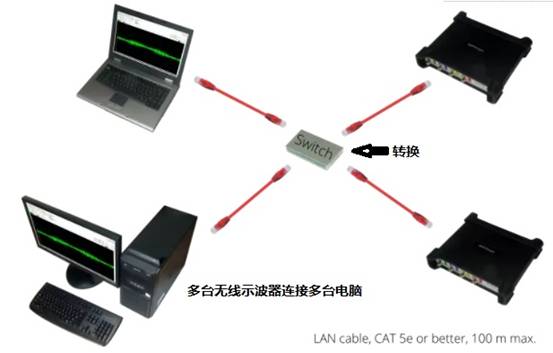第二種:遠距離采集用網(wǎng)線可達100米的距離采集。通過增加網(wǎng)絡(luò)交換機和額外的網(wǎng)絡(luò)電纜,可以以100米為單位的步幅,增加采集距離。網(wǎng)絡(luò)方式能高達20 MSa/s的實時高速數(shù)據(jù)流盤。一臺PC通過網(wǎng)絡(luò)LAN電纜直接連接到一個無線數(shù)據(jù)采集卡。