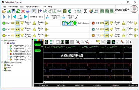 多通道軟件的快速設(shè)置:為了簡化采集設(shè)置,多通道數(shù)據(jù)采集卡軟件包含大量快速設(shè)置(快捷鍵),幾乎所有采集應(yīng)用都可以。靈活信號顯示多通道數(shù)據(jù)采集卡軟件、頻譜分析儀和數(shù)據(jù)記錄儀提供了多種靈活的方式來顯示采集信號的所有方面。它們可以有一個或多個圖形,每個圖形顯示一個或多個信號,其中每個圖形可以顯示信號的不同部分。圖形可以在Yt模式、XY模式或頻譜模式下顯示W(wǎng)S6無線數(shù)據(jù)采集卡的信號(有或無插值)。圖中所有項的顏色都可以設(shè)置為任何所需的值。圖形尺寸可以調(diào)整到任何所需的大小,圖形可以位于單個窗口中,也可以位于單獨的窗口中,這些窗口可以位于桌面上的任何位置。自動采集功能:多通道數(shù)據(jù)采集卡軟件具有許多自動采集功能,可以對ws6虛擬數(shù)據(jù)采集卡的采集信號或選擇的采集信號進行采集。使用數(shù)據(jù)采集卡中的自動采集,可以顯示信號的任何細節(jié)。兩組光標(水平和垂直)可用于指示需要徹底檢查的信號部分。自動采集包括:最小值、最大值、上下限、均方根、均值、方差、標準偏差、頻率等等幾十種,幾乎能完成所有采集功能。采集結(jié)果顯示在一個特殊的值窗口中,該窗口可以位于計算機屏幕上的任何位置。一個方便的工具欄允許您只需單擊一次即可啟用或禁用采集。采集結(jié)果可以復(fù)制到剪貼板,例如在報告中使用。打印圖形時,還包括光標和采集結(jié)果。二次開發(fā)功能:WS6數(shù)據(jù)采集卡SDK是一個跨平臺的開發(fā)庫,可通過第三方軟件使用WS6數(shù)據(jù)采集卡,包括:VB、VC、C++、C#,mablab、Labview、Python 無限縮放功能,可觀察細節(jié):