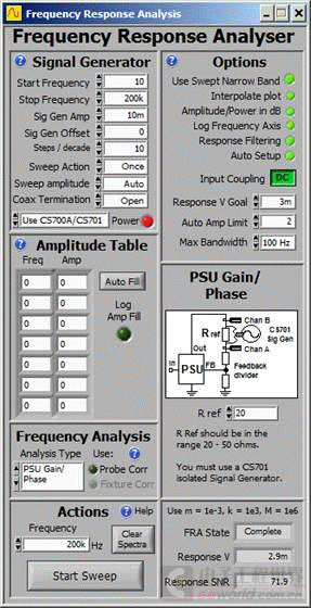 CS320A-FRA是一款高性價(jià)比的頻率響應(yīng)分析儀,由新西蘭CleverScope公司研發(fā)生產(chǎn),CleverScope公司以其虛擬示波器而著名于世。 CS320A-FRA信號產(chǎn)生部分:內(nèi)置CS701信號發(fā)生器(1mHz-65MHz,正弦波信號,輸出幅度0-7Vpp),輸出部分具有隔離輸出(300V CAT III),不需要外部隔離變壓器就就可以進(jìn)行頻率響應(yīng)分析。CS320A-FRA接收部分:就是一款USB數(shù)字示波器,10位(可以升級到14位)ADC,100MSa/s采樣速率,2個模擬通道,4M存儲深度。每個通道都具備DFT窄帶濾波器功能,實(shí)現(xiàn)高達(dá)100dB的動態(tài)范圍。增益精度0.05dB,相位精度0.1°。分析軟件可以做伯德圖,阻抗圖,PSRR曲線圖顯示,數(shù)據(jù)可以存儲成文本