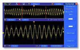 手動(dòng)模式:光標(biāo)間的電壓差△V; 光標(biāo)間的時(shí)間差△T; △T的倒數(shù),以Hz為單位(1/△T) |