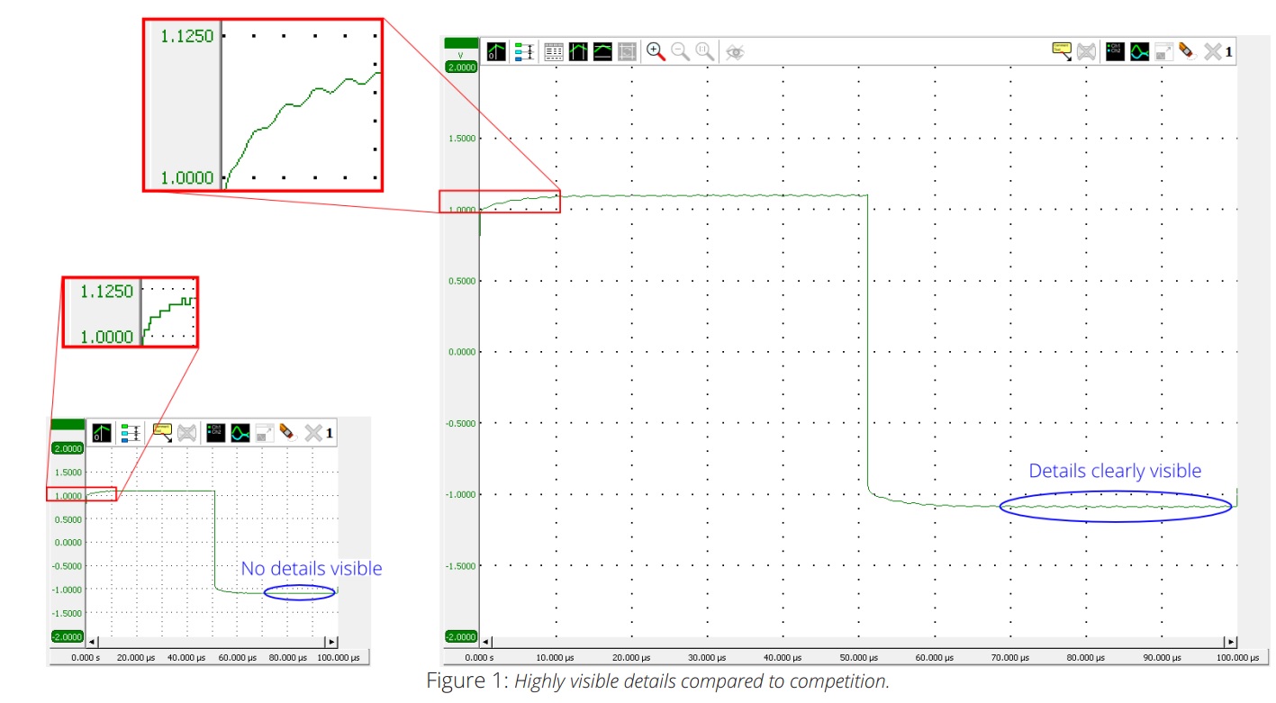 圖1所示為兩個(gè)顯示器,均顯示同一信號(hào)的測(cè)量值。左顯示尺寸相當(dāng)于一個(gè)10“顯示和8位分辨率的獨(dú)立示波器的尺寸。右顯示屏對(duì)應(yīng)于標(biāo)準(zhǔn)24“PC屏幕和16位分辨率的最大化窗口。右顯示的信號(hào)顯示的細(xì)節(jié)比左顯示的要多得多,即使沒有放大。